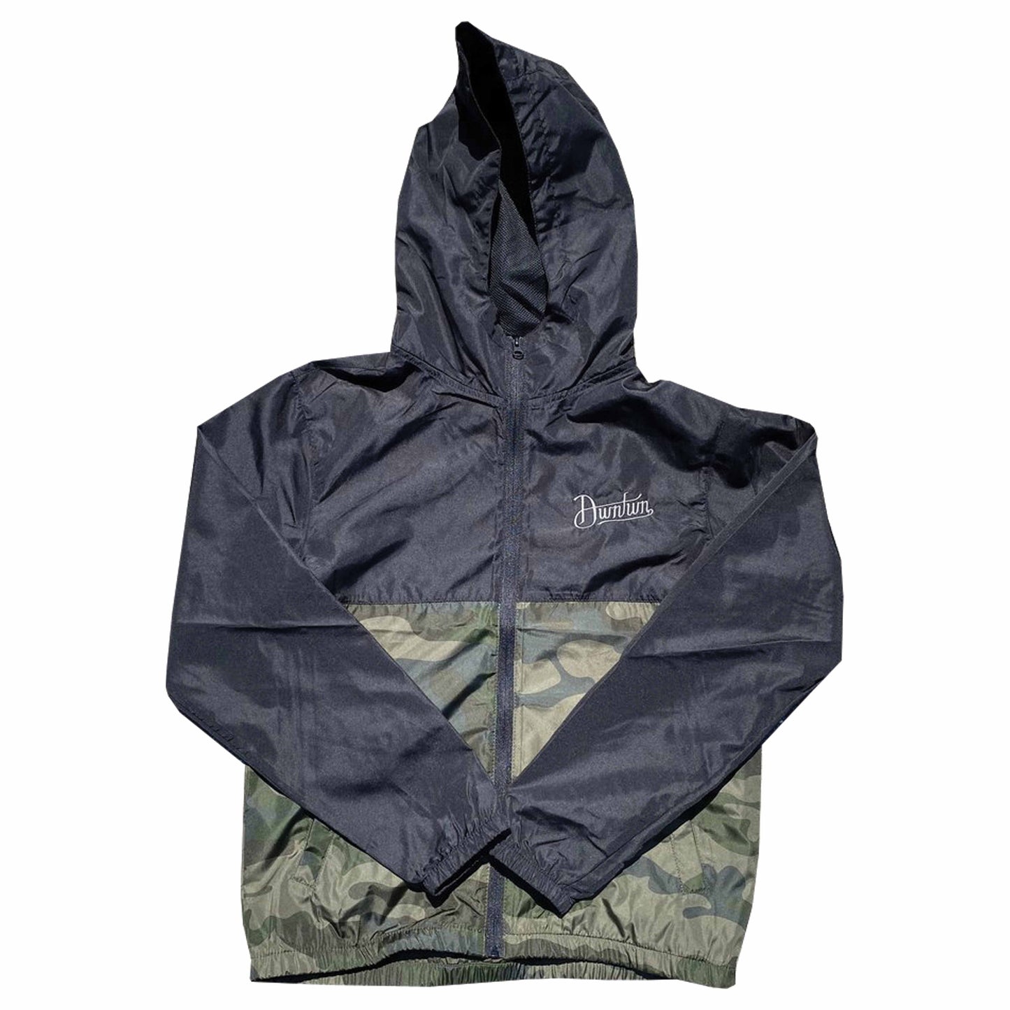The Dwntwn Handwritten windbreaker is on a lightweight full zip hooded windbreaker. Artwork is detailed embroidery.