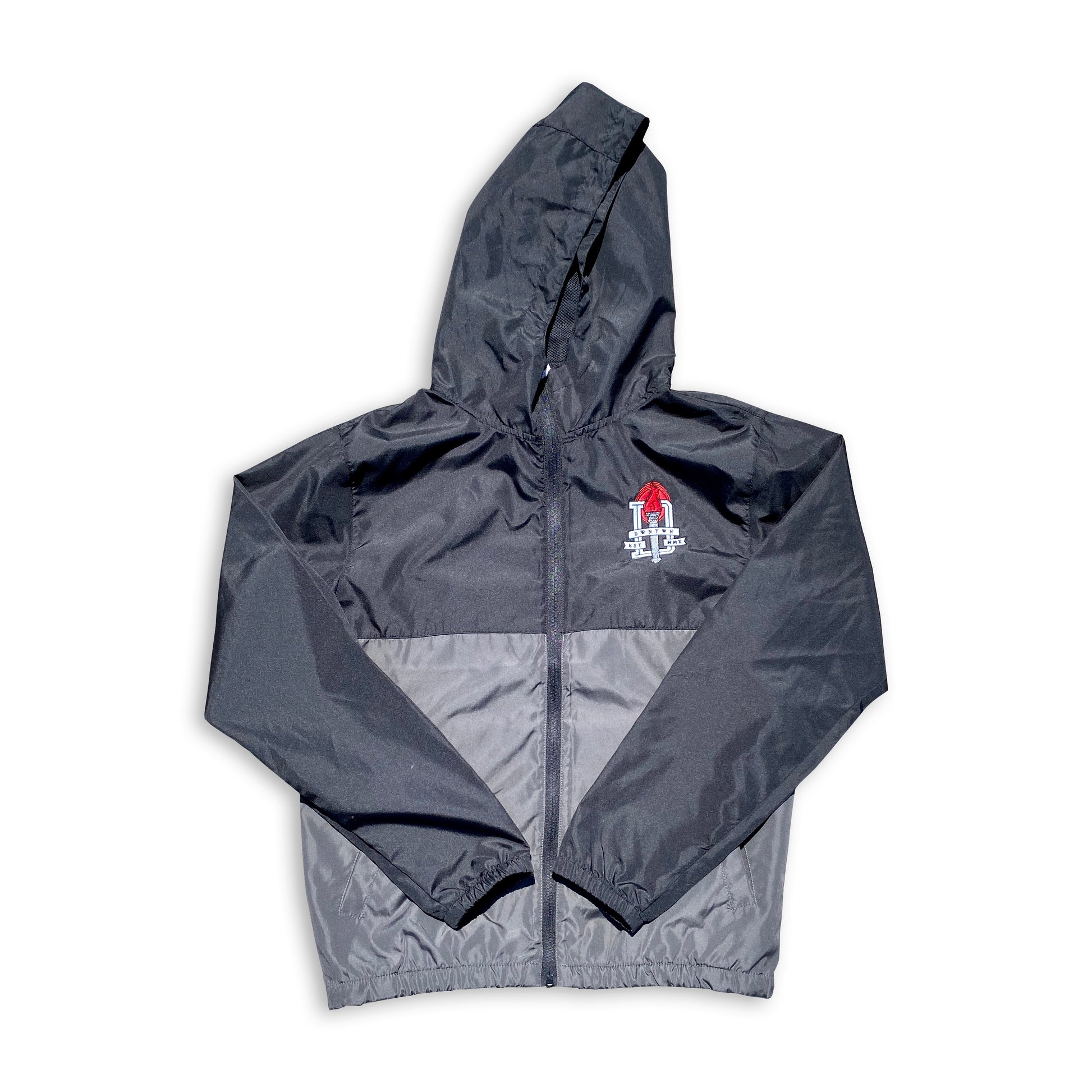 Dwntwn Liberty WINDBREAKER IS ON A LIGHTWEIGHT FULL ZIP HOODED WINDBREAKER. ARTWORK IS DETAILED EMBROIDERY.