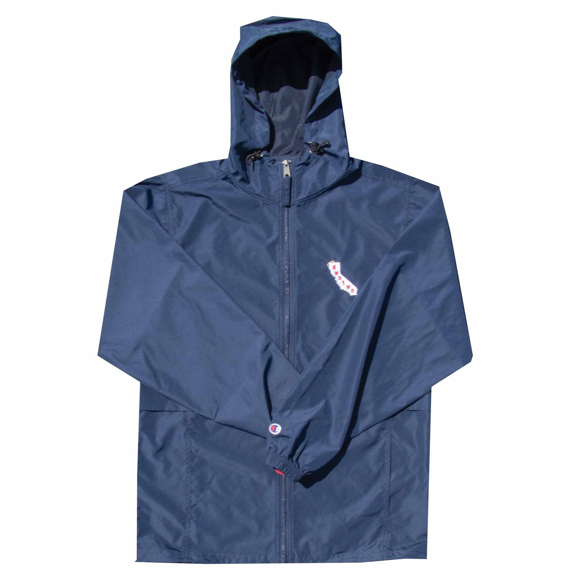 This is a full zip Champion windbreaker with detailed embroidery.